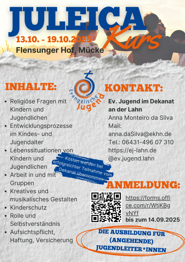 Gemeinsam mit vielen weiteren Jugendlichen, spirituellen Angeboten und jeder Menge Spaß. Es erwarten dich viele Workshops rund um die Themen Spielpädagogik, Rolle als Teamer*in, Religionspädagogik, Recht, Aufsichtspflicht, Kinderschutz, Psychologie und Lebenswelten. Darüber hinaus bietet ein buntes Rahmenprogramm viel Abwechslung und jede Menge Ideen für die eigene Umsetzung in Gruppen, bei Veranstaltungen und auf Freizeiten.