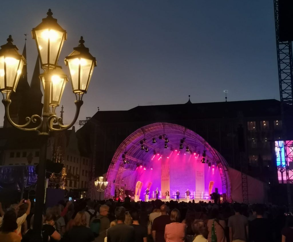 Vom 7. bis 11. Juni hieß es endlich wieder „Kirchentagsfeeling live“. Fünf Tage lang fanden in Nürnberg und der Nachbarstadt Fürth im Rahmen des Kirchentages rund 2.000 Veranstaltungen statt – darunter gesellschaftspolitische Diskussionen, interreligiöse Dialoge, Bibelarbeiten, neue Gottesdienstformen, große und kleine Kulturveranstaltungen. 70.000 Menschen mit einem Ticket waren vor Ort, auf dem Abend der Begegnung gar 130.000 in der Altstadt unterwegs. Es wurde miteinander in Gemeinschaft gefeiert, gebetet, diskutiert, gestritten – und es wurde Tacheles geredet, so z.B. im Abschlussgottesdienst Rassismus und Ausgrenzung auch innerhalb der Kirche angeklagt und ein deutliches Handeln in der Klima- und Asylpolitik gefordert.